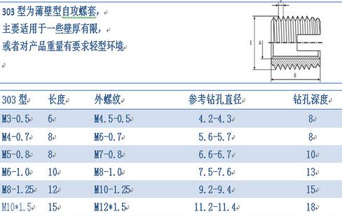 薄壁型沧州自攻螺套外观上看主要有两种区分,一种是一端开槽型的,另一种是一端三圆孔型的,其中开圆孔型的又分为307型和308型两种,307型和308型外观主要区别就是同一直径下,长度和外径大小有所区分。以上各种型式螺套均具有自行攻牙功能。